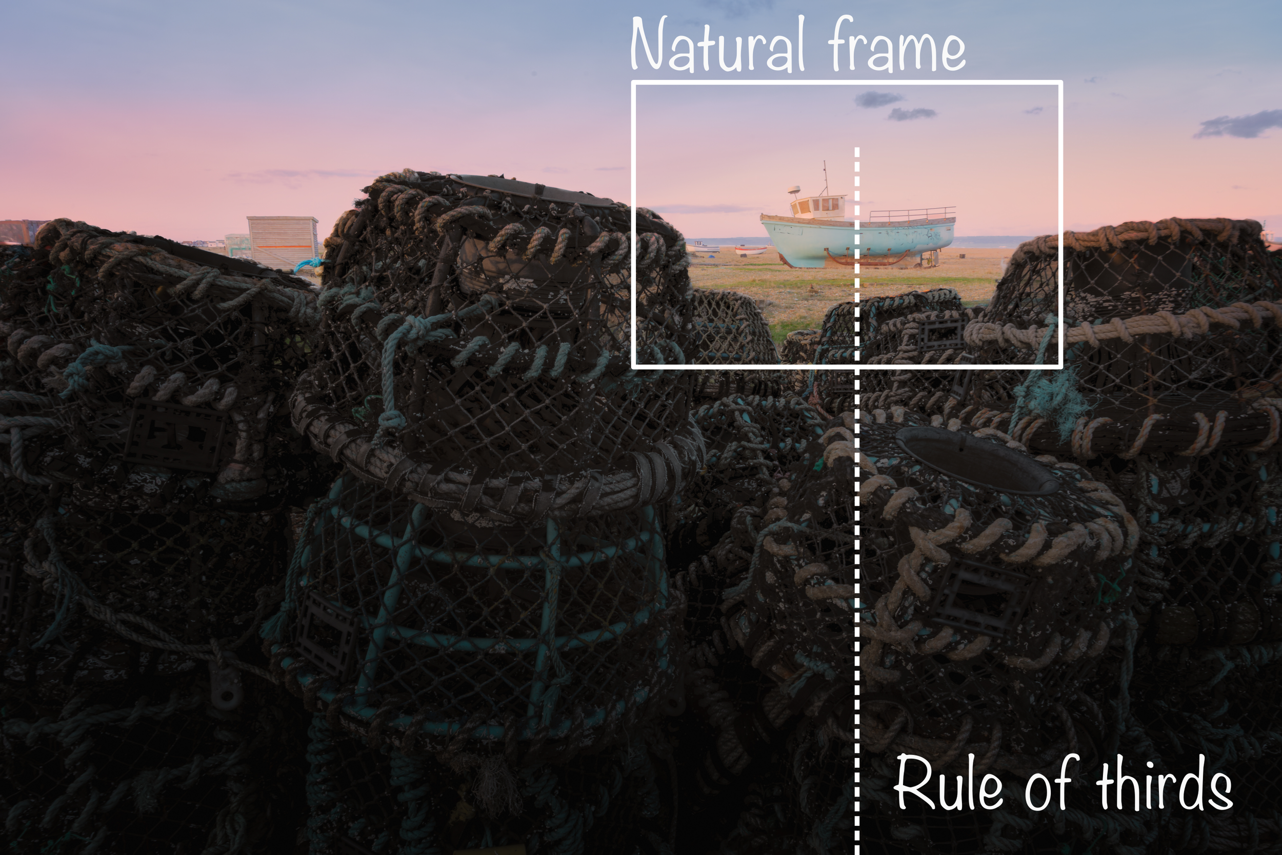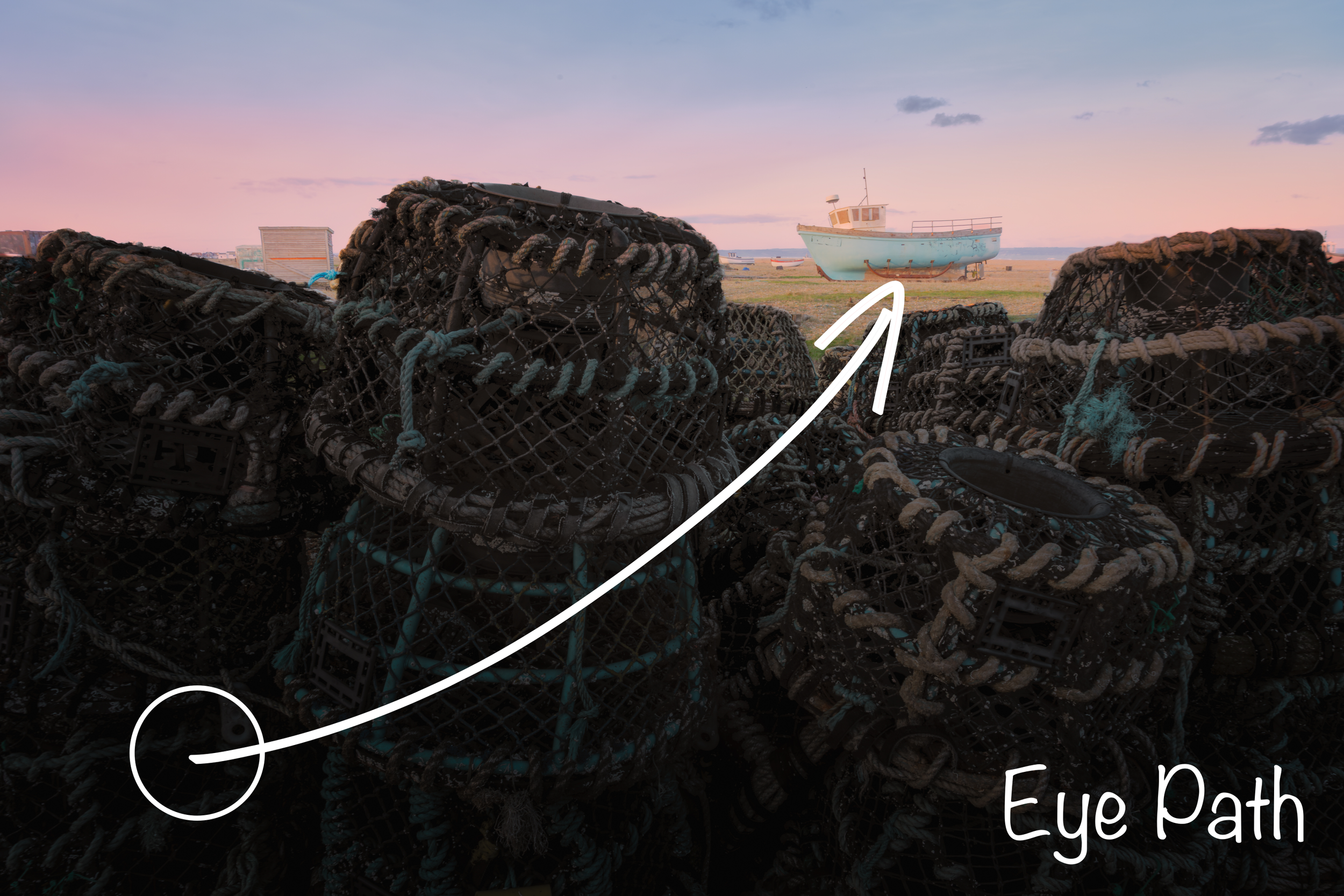 Finally, the boat picture on Dungeness, this place means a lot to me, I grew up not far from it, I volunteered at the lifeboat station not far away and I got my first job as a fish monger at Richardson’s opposite the pilot. The fishing community plays a big role here, and that needs to be respected. I loved how theses lobster pots were stacked, they were stacked much higher than me, and I tried to convey that in the framing, the wall of pots, the scale, the peep of the boat that might lay them on the sea floor, all at dusk where the light was very washed and pasteled. I tried to convey the that experience walking amongst this typical coastal scene.